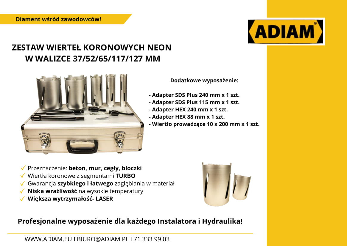 Profesjonalny zestaw 5 wierteł koronowych diamentowych NEON marki ADIAM w solidnej walizce. Wyposażony w segmenty TURBO łączone laserowo, co zapewnia błyskawiczne wiercenie w betonie, cegle i murze. W komplecie pełen zestaw adapterów SDS Plus oraz HEX.
